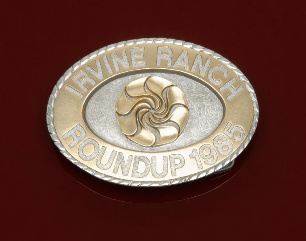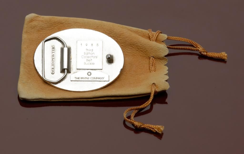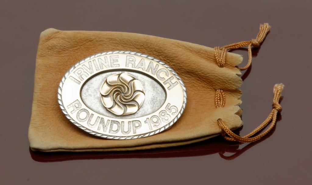 Irvine Ranch Round Up buckle 1985 gifted by Donald Bren to our consigner. Solid pewter. Third Edition with Irvine Co. seal. Est.: $75-$150