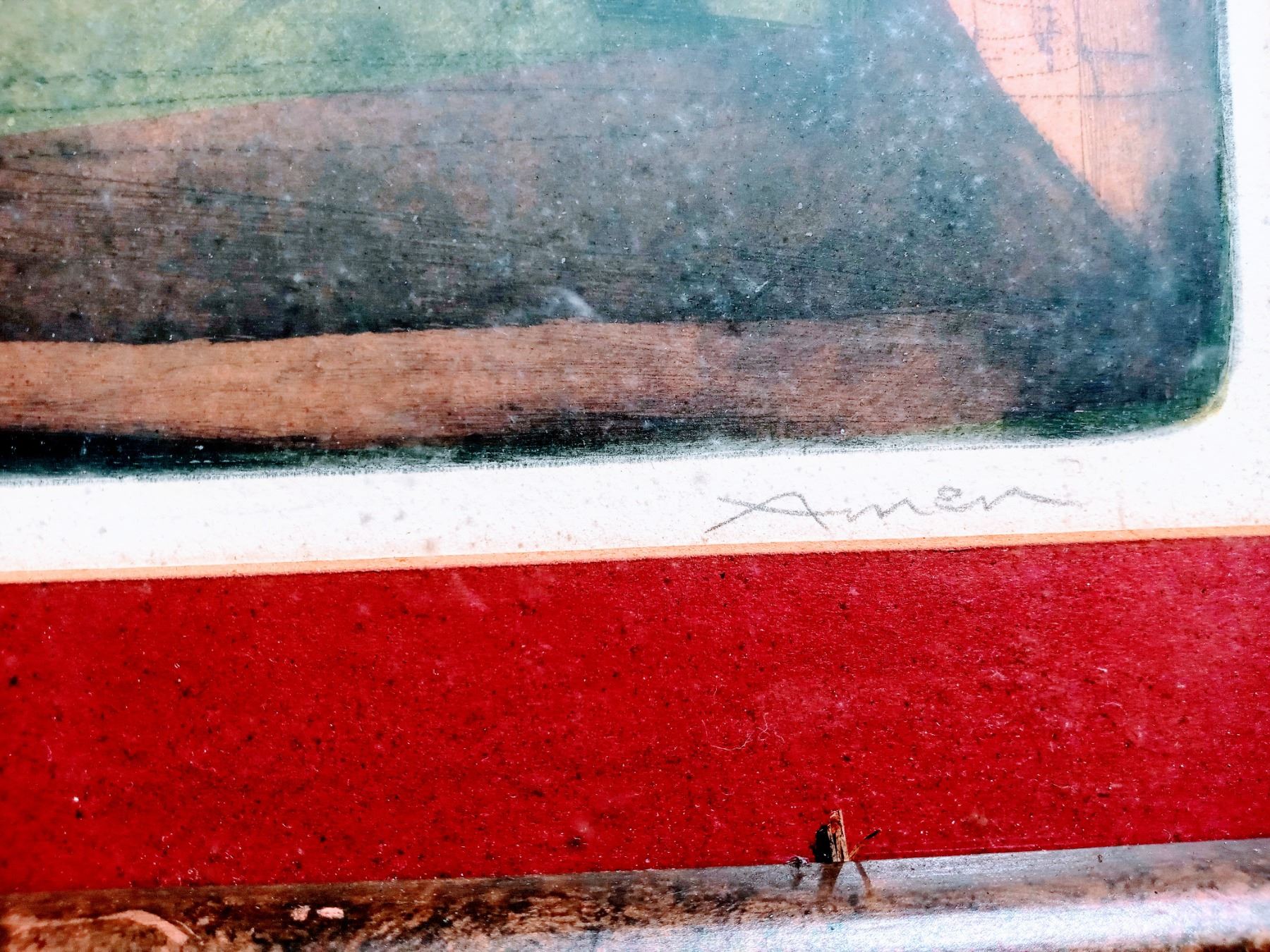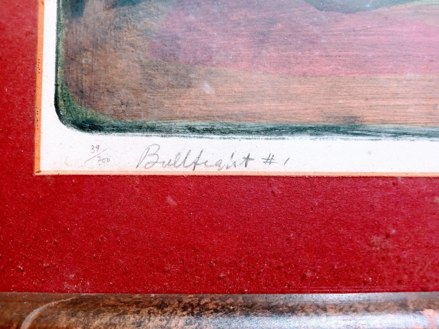 Irving Amen color woodblock "Bullfight" matted and framed 17" H x 23" W. Irving Amen was born in New York City in 1918. Amen began drawing at the age of four. Amen studied in Paris in 1950 - 1953. Upon his return to the United States, he had one man shows in New York and Washington DC. (American 1918 -2011) .* ( Wikipedia )