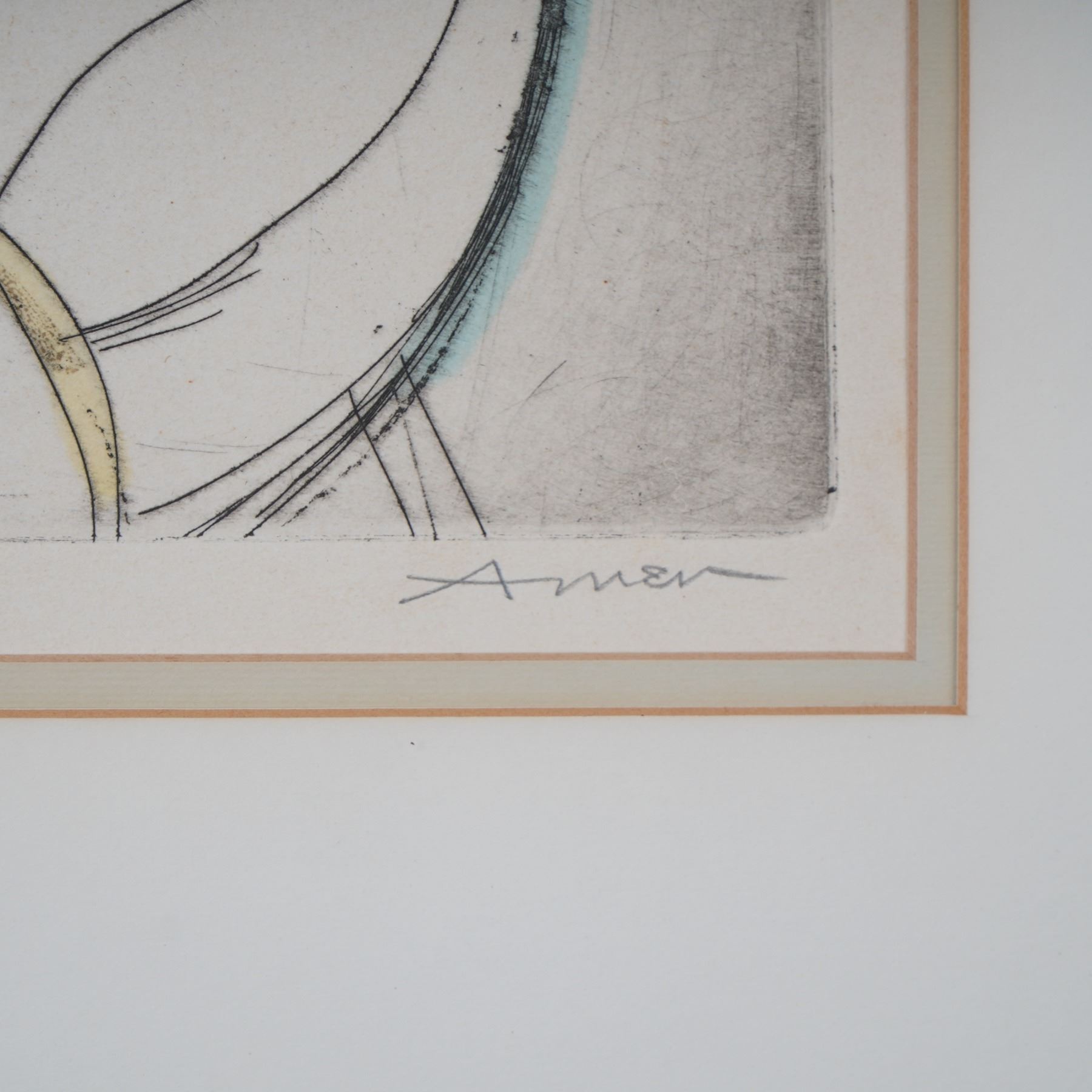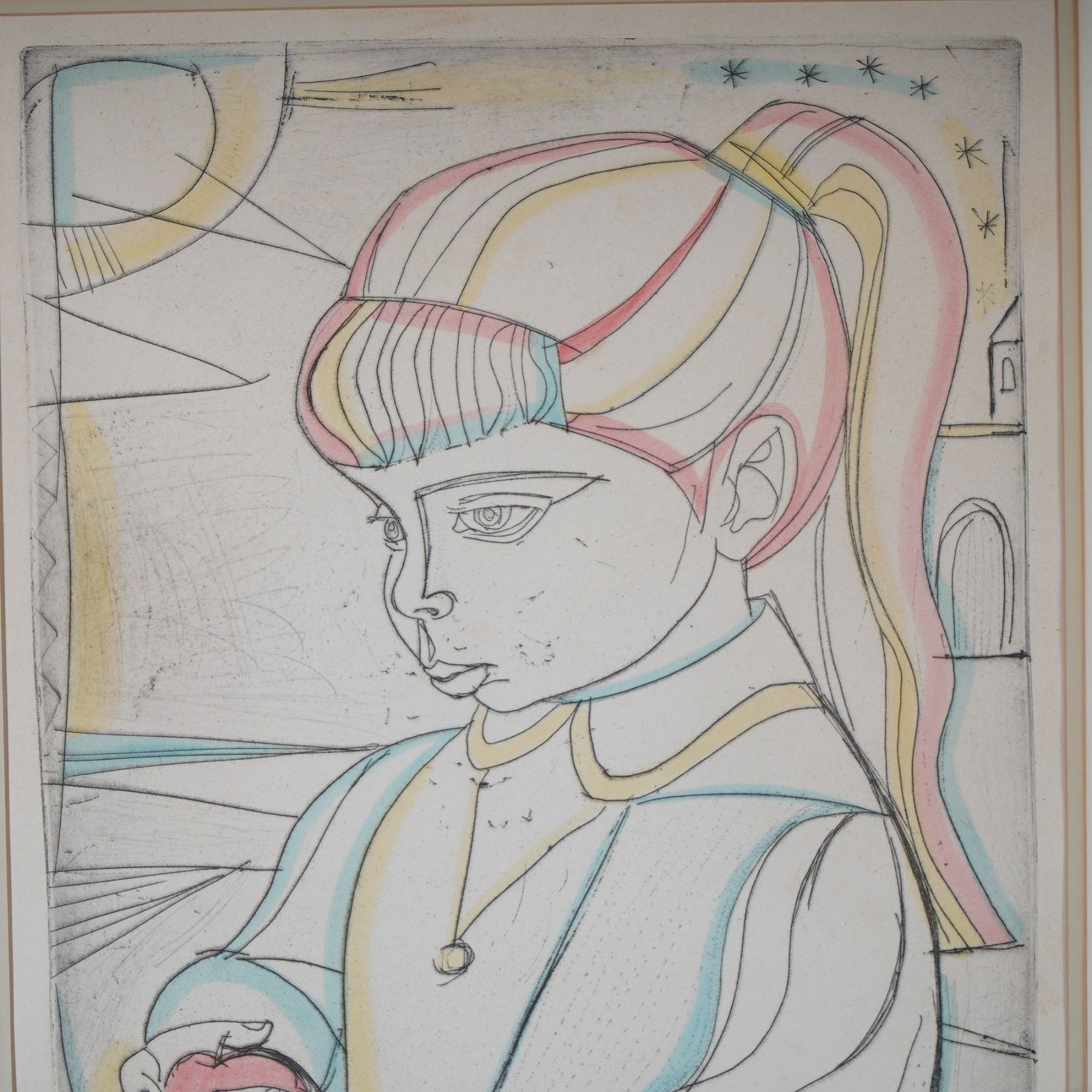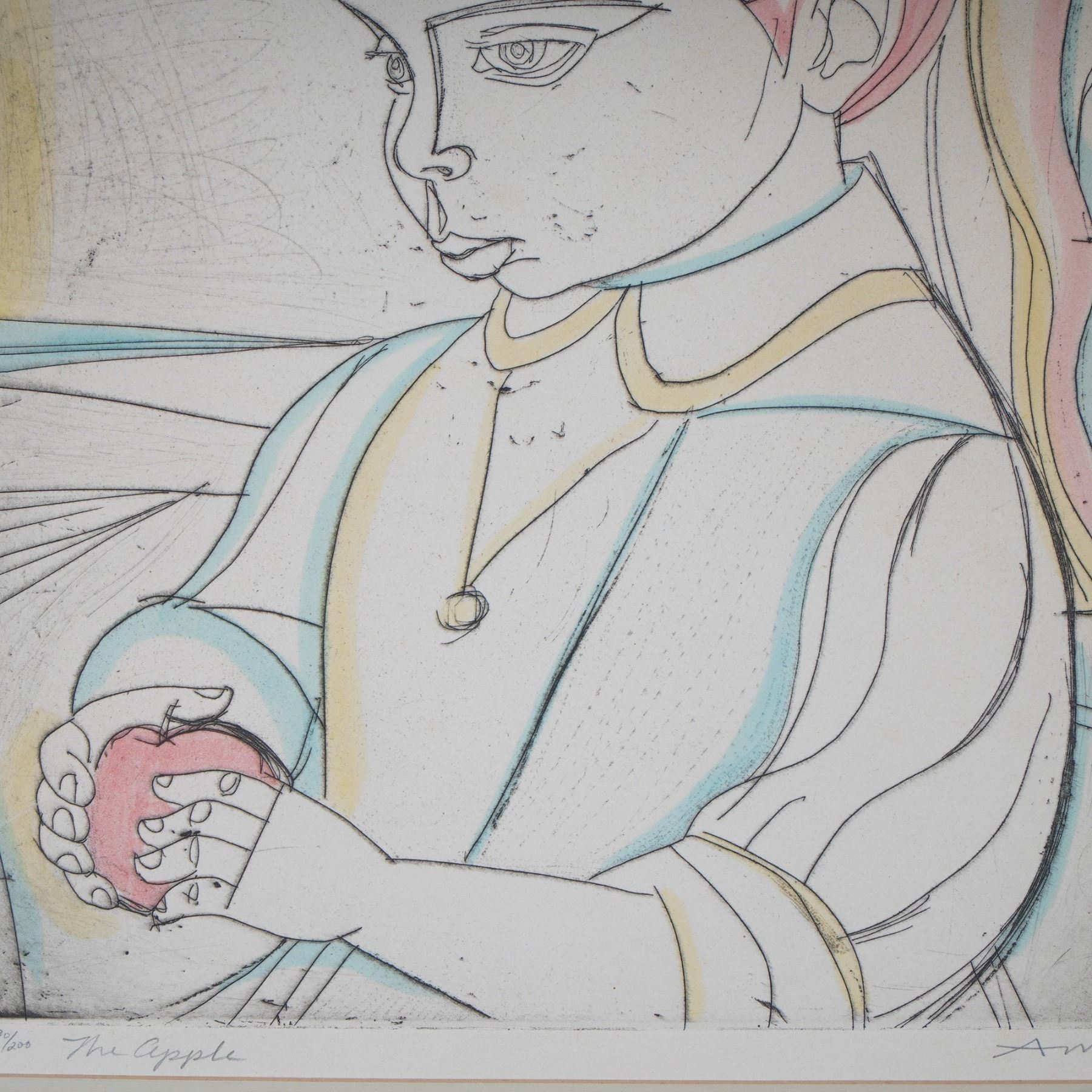 Captivating color etching titled The Apple by celebrated American artist Irving Amen, whose bold line work and delicate use of color create a mesmerizing narrative. Known for his profound interest in humanity, music, and spirituality, Amen was a master printmaker whose work echoes elements of Cubism and Expressionism, and his pieces are held in prestigious institutions such as the Museum of Modern Art and the Metropolitan Museum of Art. This particular piece, rendered with Amen's signature blend of whimsy and structure, depicts a young girl holding an apple, a timeless symbol of knowledge and innocence, captured in an ethereal pastel palette with intricate line etching. Hand-signed by the artist and numbered 90/200, it comes with a Certificate of Authenticity. This is an exceptional opportunity to acquire a poignant work from one of the 20th century's most distinctive American printmakers. Signature on lower right.