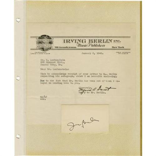 <B>Irving Berlin Autograph.</B></I> A 3.5" x 2" card signed by the prodigious songwriter in black ink. The autograph card itself is affixed to a letter, regarding the autograph, from his personal assistant and dated January 5, 1940. Both items are in Very Fine condition with moderate age-toning, and encased in a loose album page.<BR><BR><b>Shipping:</b> Flat Material, Small (<a target="_blank" href="http://www.heritageauctions.com/common/shipping.php">view shipping information</a>)