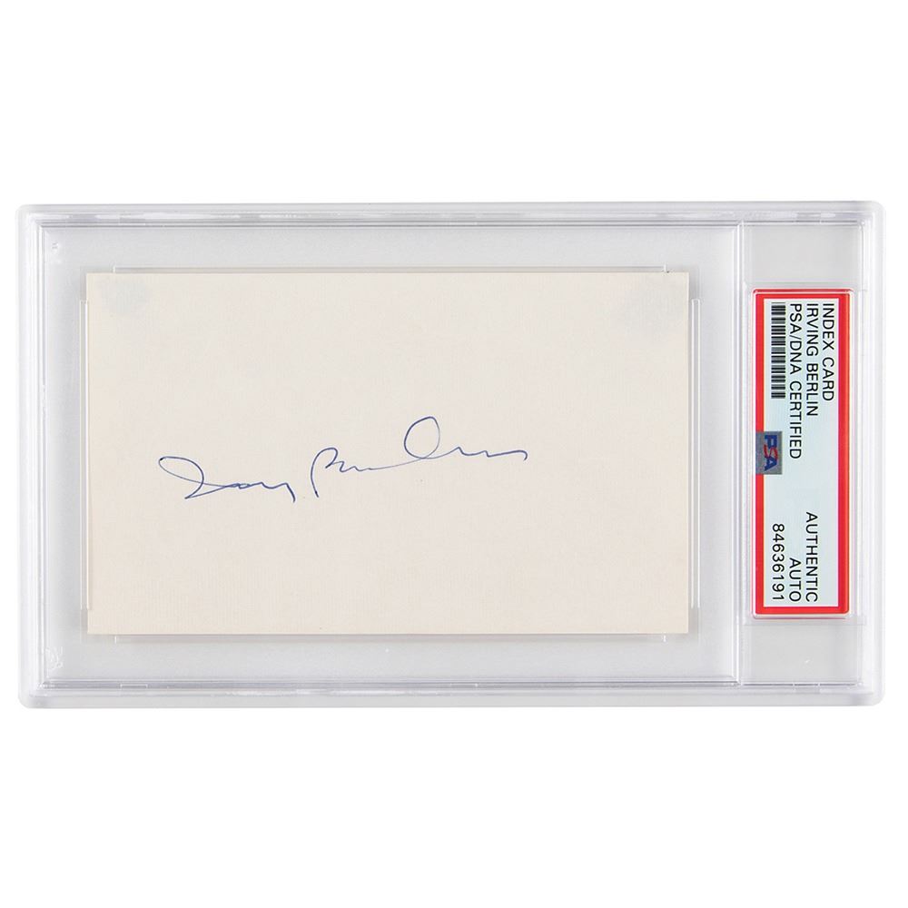 Ballpoint signature, "Irving Berlin,†on an off-white 5 x 3 card. In fine condition, with light show-through at the top corners from small old mounting remnants on the back. Encapsulated in a PSA/DNA authentication holder.