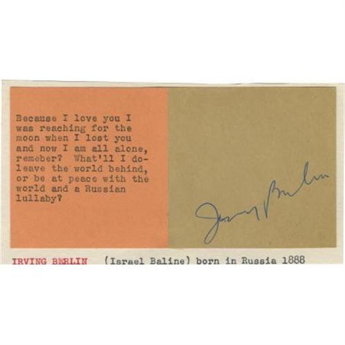 <B>Irving Berlin Signature</B></I> on card, 5.75 x 2.75, mounted on stiff card stock with a typed note from Berlin and brief biographical information. Berlin (1888-1989) was a Russian-American composer and lyricist, one of the most prodigious and famous American songwriters in history. Berlin was one of the few Tin Pan Alley/Broadway songwriters who wrote both lyrics and music for his songs. Although he never learned to read music beyond a rudimentary level, he composed over 3,000 songs, many of which ("God Bless America", "White Christmas", "Alexander's Ragtime Band", "There's No Business Like Show Business") left an indelible mark on American music and culture. In addition to his individual songs, he also composed 17 film scores and 21 Broadway scores. Very fine. <BR><BR><b>Shipping:</b> Flat Material, Small (<a target="_blank" href="http://www.heritageauctions.com/common/shipping.php">view shipping information</a>\)