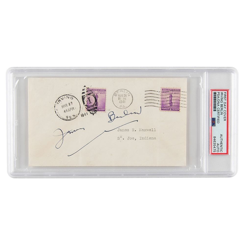 World War II-dated postal cover signed nicely in fountain pen by Irving Berlin, cleverly postmarked in cities bearing his first and last names in March of 1941. In fine condition. Encapsulated in a PSA/DNA authentication holder.
