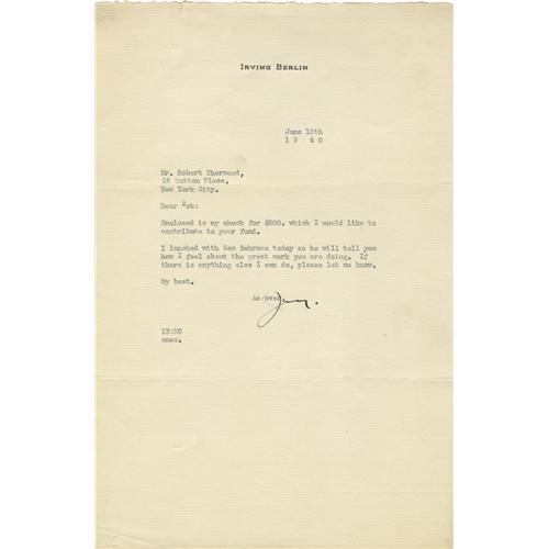 <B>Irving Berlin Typed Letter Signed</B></I> "<I>Irving</B></I>", one page on Irving Berlin stationary, 7.25" x 11", June 12, 1940, New York . To Robert Sherwood forwarding a check for $500 (not included) for his "fund" and commending Sherwood for his work. In 1940, Sherwood was very active in the Finnish Relief Fund. That year, his play, <I>There Shall Be No Night,</B></I> the story of the Russian invasion of Finland opened in New York. Intriguing content and in excellent condition. <BR><BR><b>Shipping:</b> Flat Material, Small (<a target="_blank" href="http://www.heritageauctions.com/common/shipping.php">view shipping information</a>)