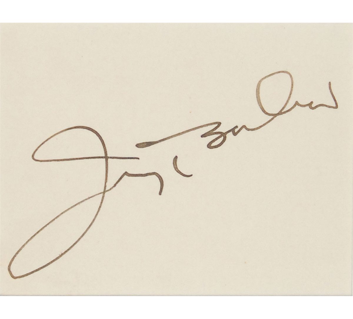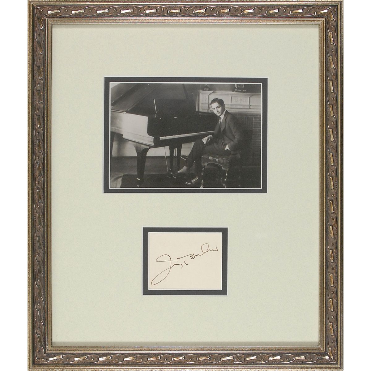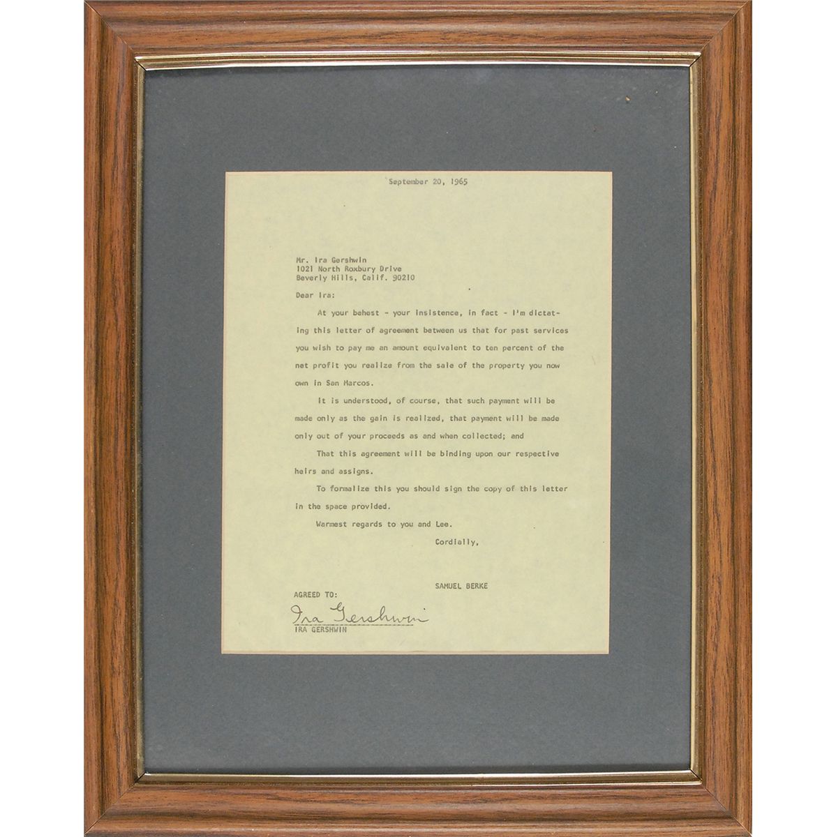 Two items: first, an ink signature, “Irving Berlin,” on a off-white card. Double-matted and framed with a portrait of Berlin at a piano to an overall size of 13 x 15.25. Second, a DS, signed “Ira Gershwin,” one page, 7.25 x 9, September 20, 1965. Agreement between Gershwin and Samuel Berke regarding the payment in assisting in the sale of Gershwin’s property in San Marcos. Matted and framed to an overall size of 12.5 x 15.5. In fine condition.