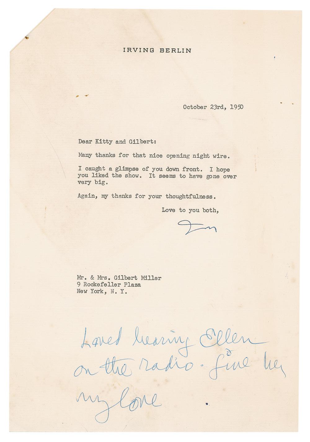 TLS signed “Irving,” one page, 7.25 x 10.5, October 23, 1950. Berlin writes to multiple-Tony-winning producer Gilbert Miller (1884–1970) and his wife. In full: “Many thanks for that nice opening night wire. I caught a glimpse of you down front. I hope you liked the show. It seems to have gone over very big. Again, my thanks for your thoughtfulness.” The event Berlin alludes to was the opening night for his musical Call Me Madam, which premiered at the Imperial Theater on October 12, 1950. The show won four Tony Awards, including Best Score for Berlin himself and Best Actress in a Musical for Ethel Merman. In fine condition, with a few wrinkles, staple holes with tiny rust spots, and an ink notation (a handwritten draft of Gilbert’s reply) to blank bottom portion of letter. Accompanied by an unsigned carbon of Miller’s reply, stapled to the top left corner of Berlin’s letter.