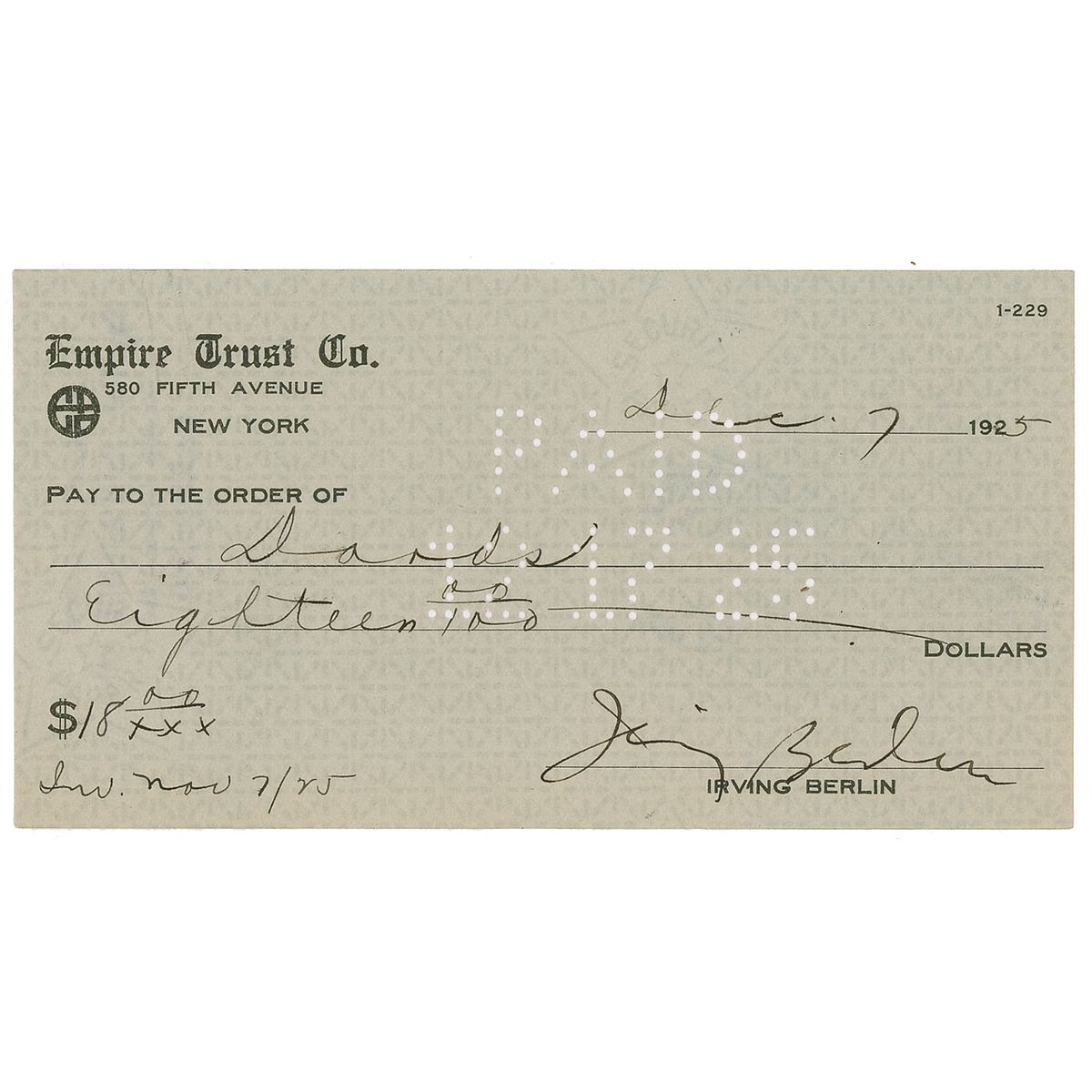 Check, 6 x 3.25, filled out in another hand and signed by Berlin, payable to Dards for $18.00, December 7, 1925. In fine condition, with the expected cancellation holes and some show-through from stamps on the reverse, none of which affect the strong, crisp signature.