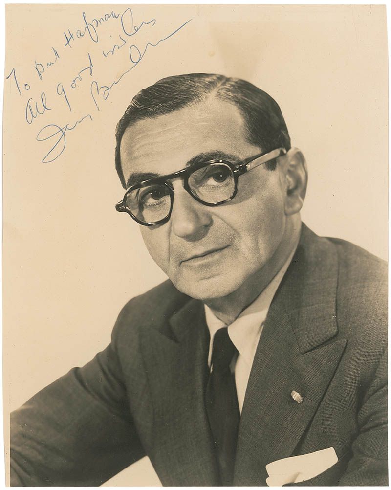 Matte-finish 7.5 x 9.5 portrait of Berlin, signed and inscribed in blue ballpoint “To Bud Hafman, all good wishes, Irving Berlin.” In very good condition, with scattered marks and silvering to the image, a paperclip impression to the top, and trimmed edges. Accompanied by the original transmittal memo from his assistant, dated January 2, 1968.