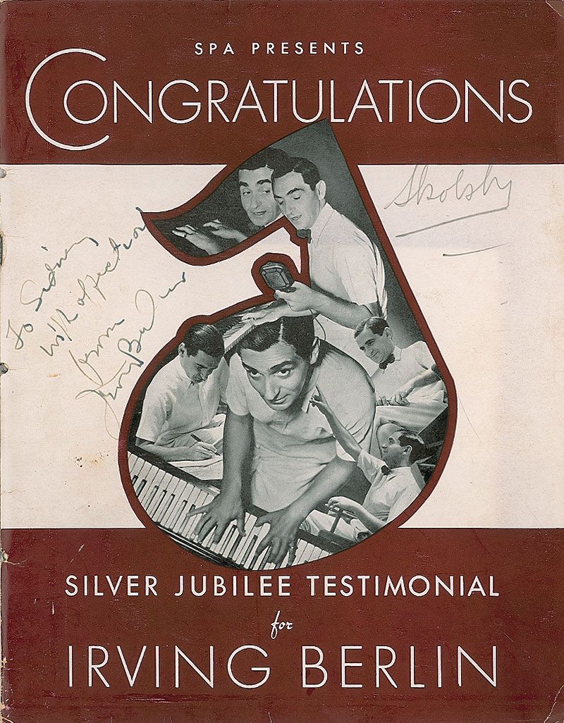Program from the Silver Jubilee Testimonial for Irving Berlin, January 20, 1936, 8.25 x 10.5, signed and inscribed on the cover in fountain pen, “To Sidney [Skolsky], with affection, from Irving Berlin.” Also signed in pencil by Skolsky, a columnist. Ligh