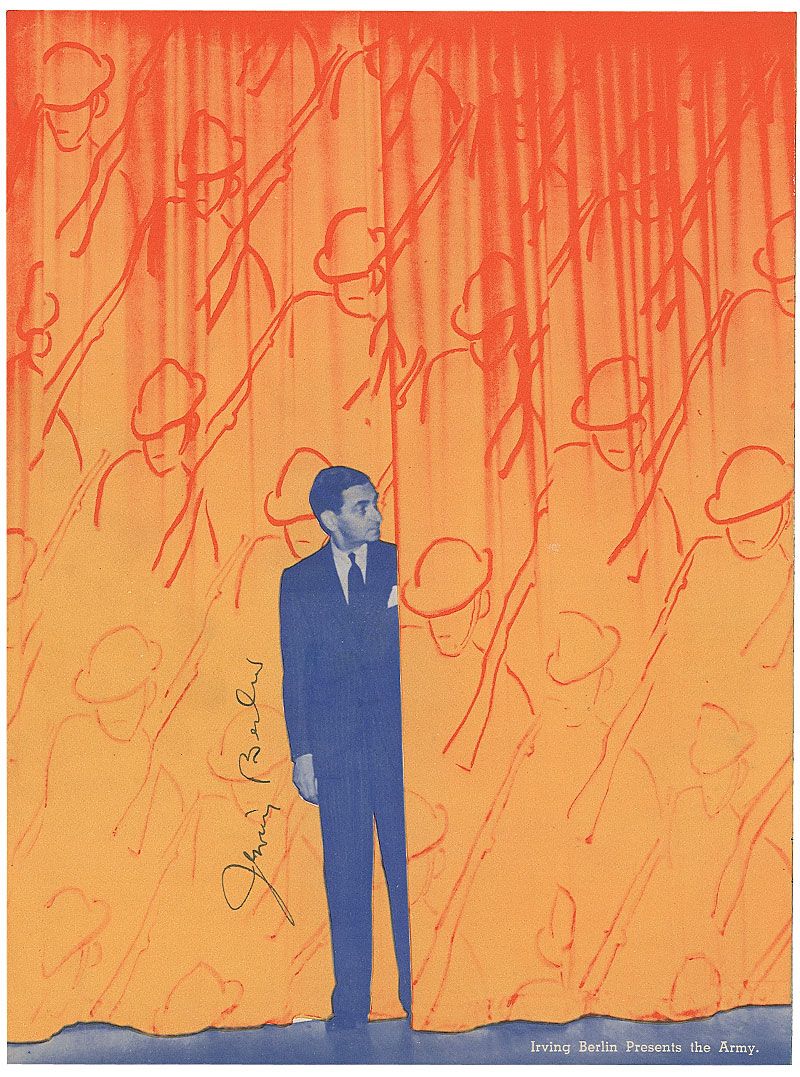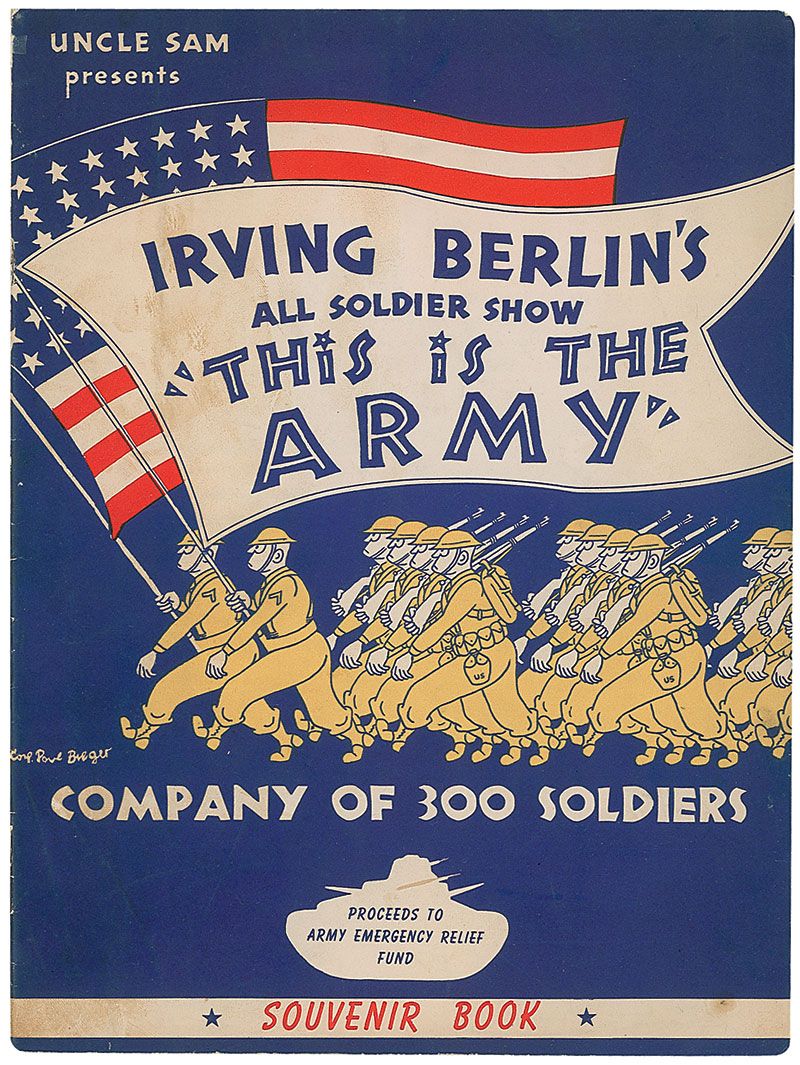 Vintage souvenir book from “Irving Berlin’s All Soldier Show ‘This Is the Army,’” 9 x 12, signed inside vertically in fountain pen on Berlin’s full page photo. Also signed on inside front cover by producer/director/actor Ezra Stone. Scattered light toning