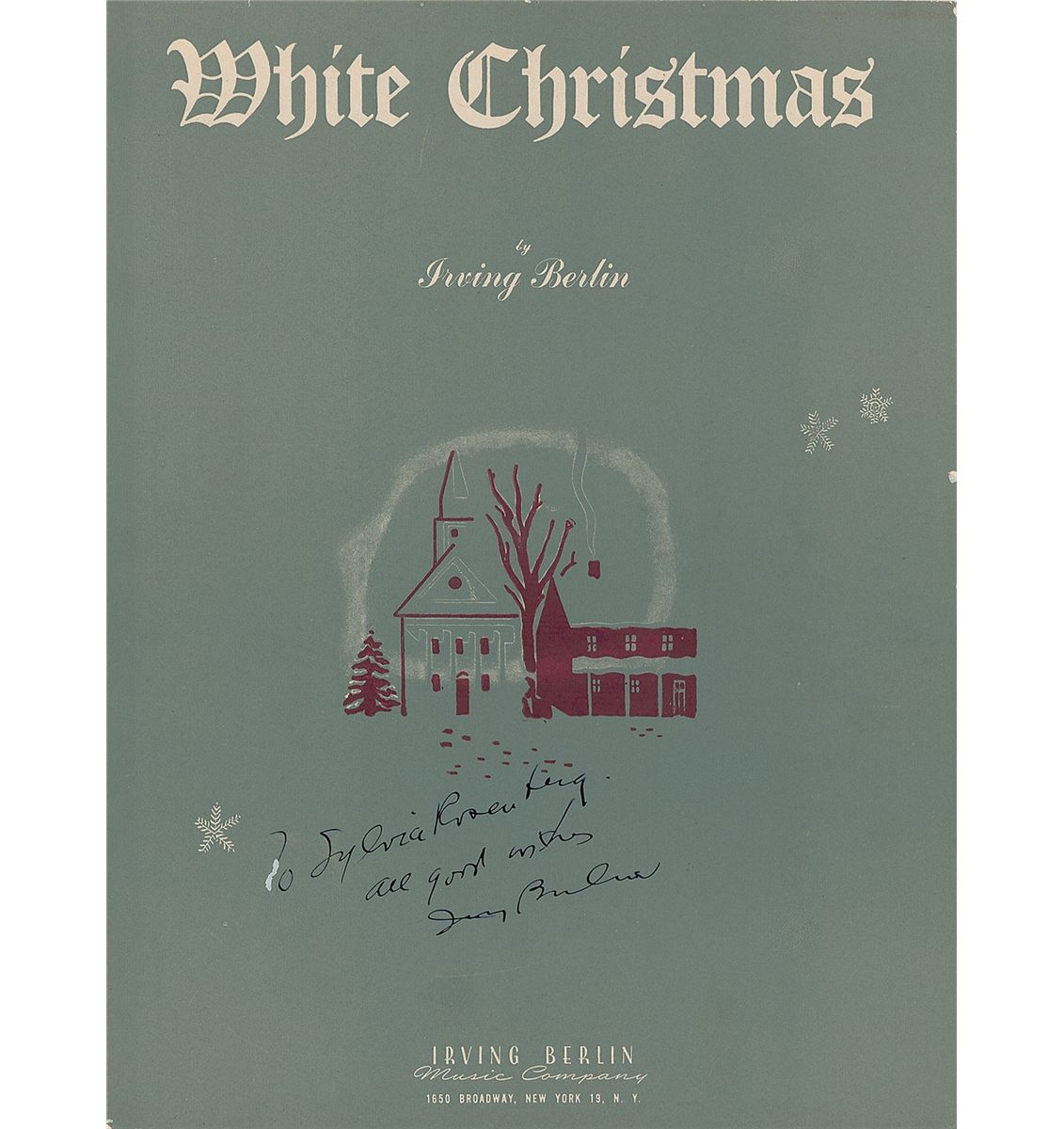 Vintage sheet music for ‘White Christmas,’ 9 x 12, three pages, signed and inscribed on the front cover in fountain pen, “To Sylvia Rosenberg, all good wishes, Irving Berlin.” A spot of whiteout slightly affecting the inscription, and some light chipping to edges, otherwise fine condition