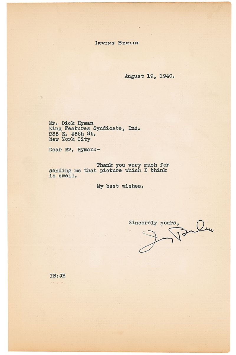 TLS, one page, 7 x 11, personal letterhead, August 19, 1940. Letter to Dick Hyman of Hearst’s King Features Syndicate. In full: “Thank you very much for sending me that picture which I think is swell.” In fine condition, with light toning working in from the borders and a horizontal mailing fold through the very bottom of the signature. Accompanied by a postcard photo of Berlin.