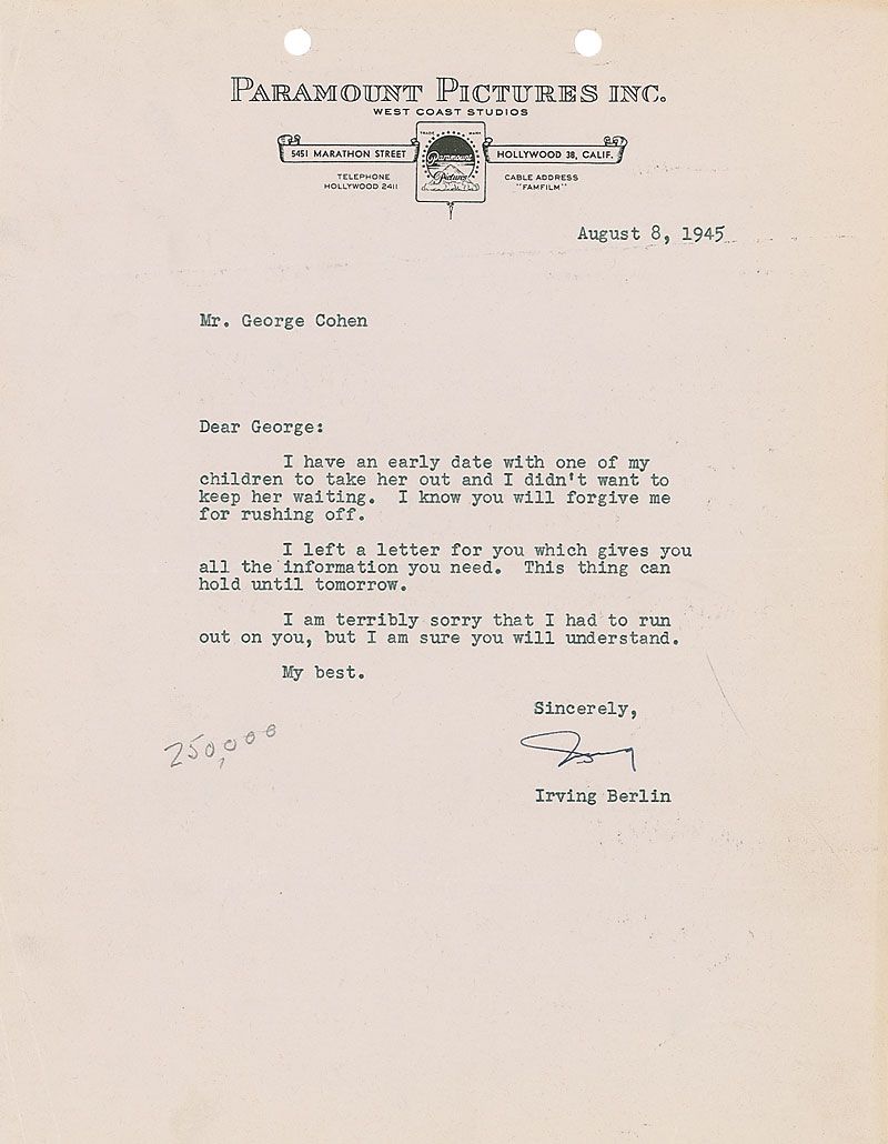 TLS signed “Irving,” one page, 8.5 x 11, Paramount Pictures letterhead, August 8, 1945. Letter to George Cohen. In part: “I have an early date with one of my children to take her out and I didn’t want to keep her waiting. I know you will forgive me for rushing off.” In fine condition, with filing holes to the top and a pencil office notation to bottom.