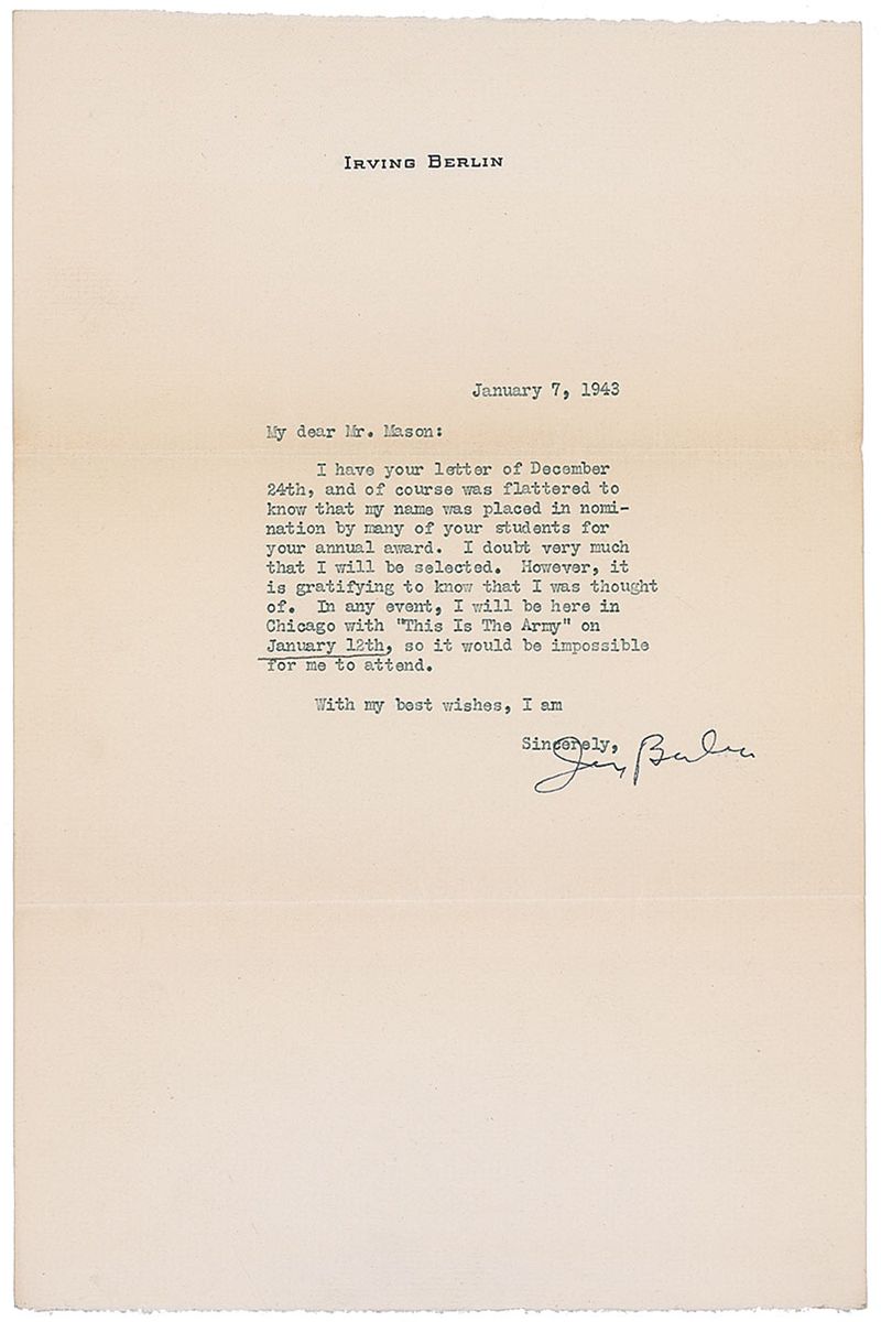 TLS, one page, 7.25 x 11, personal letterhead, January 7, 1943. In part: “I…was flattered to know that my name was placed in nomination by many of your students for your annual award. I doubt very much I will be selected…I will be here in Chicago with ‘This Is The Army’ in Chicago on January 12th, so it would be impossible for me to attend.” In fine condition. Accompanied by an unsigned vintage glossy 8 x 10 photo of Berlin at a piano.
