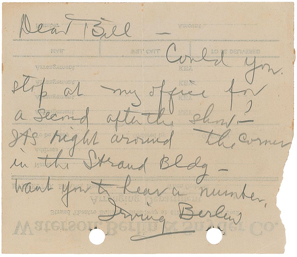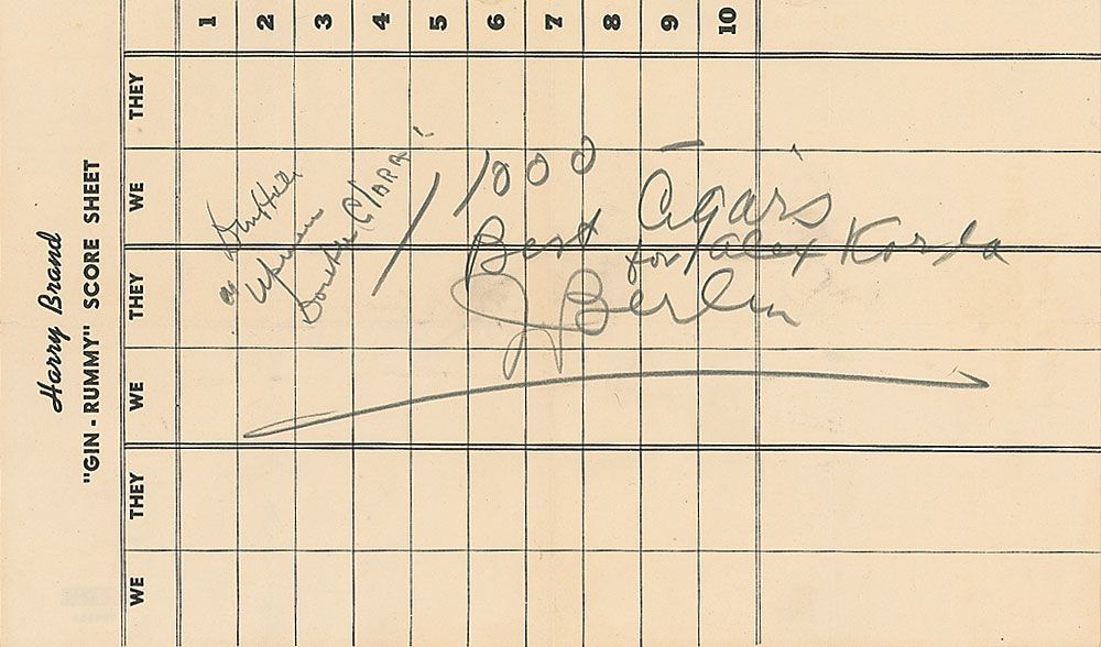Two undated notes in pencil from Berlin to Collier. First is signed “Irving Berlin,” one page on the reverse of a 6.5 x 5.5 Strand Theatre memo sheet, in part: “Stop at my office for a second after the show…I want to hear a number.” Second is signed “I. Berlin,” one page on a 10 x 6 gin rummy score sheet, and mentions “Best Cigars” and “Alex Korda.” A rough right edge to the first letter and unobtrusive folds to both, otherwise overall fine condition. Both are accompanied by certificates of authenticity from PSA/DNA. Provenance: William Collier Family Collection.