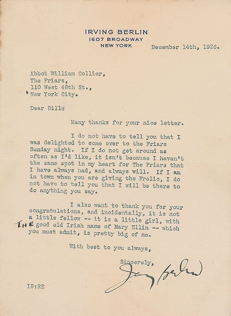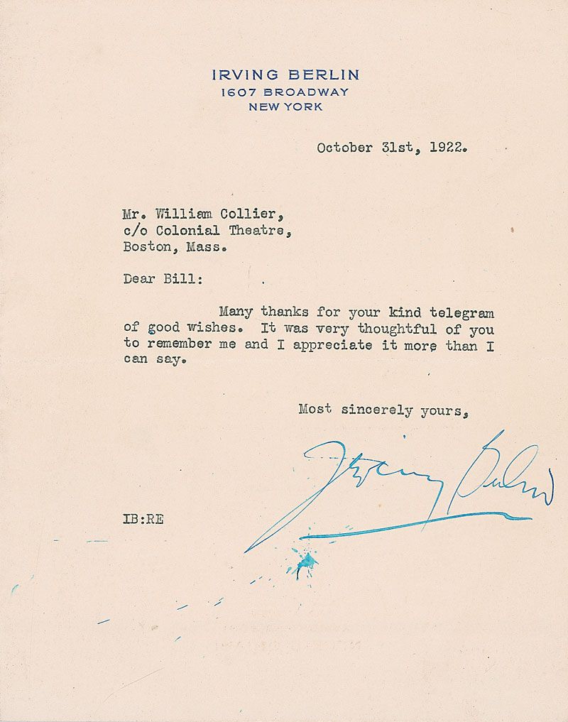 Two TLSs, each one page, 5.5 x 7.5, personal letterhead, October 31, 1922, and December 14, 1926. The first, in part: “Many thanks for your kind telegram of good wishes.” The second, in part: “Thank you for your congratulations, and incidentally it is not a little fellow—it is a little girl, with the good old Irish name of Mary Ellin—which you must admit, is pretty big of me.” In overall fine condition, with a spot of stray ink to the earlier letter. Both are accompanied by certificates of authenticity from PSA/DNA. Provenance: William Collier Family Collection.