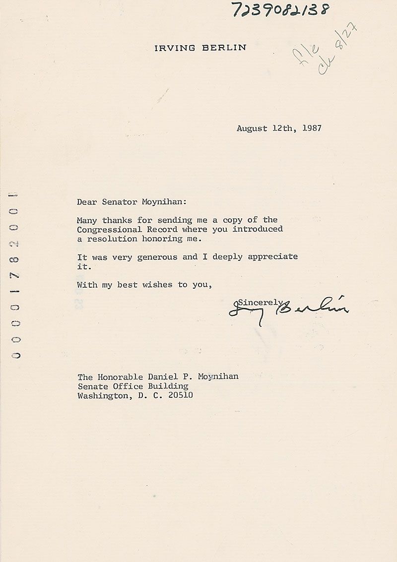 TLS, one page, 7 x 25, personal letterhead, August 12, 1987. Berlin writes to Senator Daniel Patrick Moynihan. In part: “Many thanks for sending me a copy of the Congressional Record where you introduced a resolution honoring me. It was very generous and I deeply appreciate it.” Staple holes and secretarial stamps and notations, otherwise fine condition.