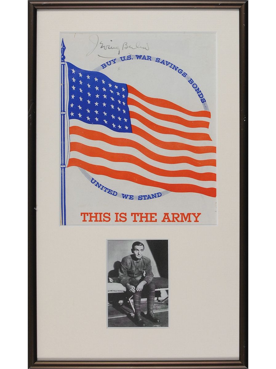 Vintage US War Bond advertisement, 5.5 x 7, signed at the top in fountain pen by Berlin. Matted and framed with a small photo of Berlin in an army uniform to an overall size of 8.25 x 13.75. In fine condition.