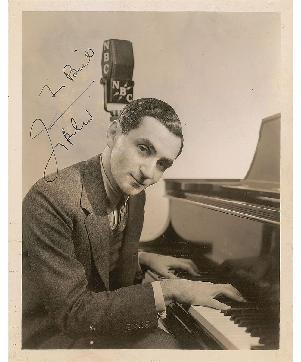Vintage glossy 8 x 10 photo of a young Berlin sitting at a piano with an NBC microphone behind him, signed and inscribed in fountain pen, “To Bill, Irving Berlin.” Photo is affixed to a slightly larger sheet of cardstock. In fine condition, with a subtle paperclip impression to top edge and some scattered light spotting to finish.