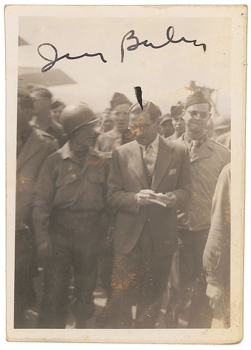 Vintage matte-finish 2.25 x 3.25 candid photo of Berlin among a group of American soldiers, signed in fountain pen, “Irving Berlin,” the composer adding a small arrow pointing to himself. In fine condition, with mild soiling, a touch of edge wear, and some mild scattered spotting to emulsion.
