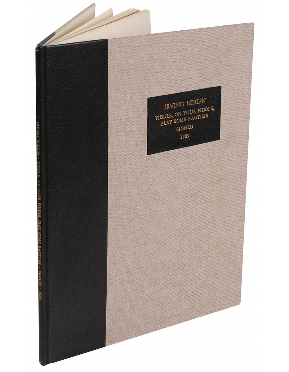 Sheet music for ‘Yiddle on Your Fiddle, Play Some Rag Time,’ 10 x 13, five pages, signed on the front cover in blue ink by Berlin. Music is housed in a custom-made hardbound presentation which measures 10.5 x 13.25. In fine condition, with a few scattered light folds and creases to cover, and a small repair to top right corner tip.