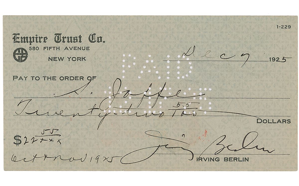 Uncommon bank check, 6 x 3, filled out and signed by Berlin, payable to S. Jaffe for $25.55, December 7, 1925. In fine condition, with cancellation holes to center and a trivial brush to signature.