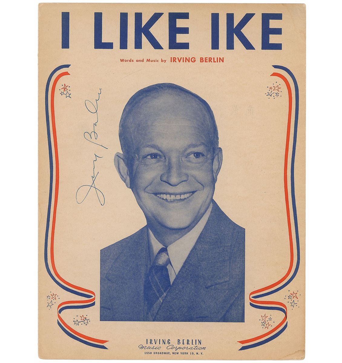 Sheet music to ‘I Like Ike,’ 9 x 12, three pages, signed vertically on the front cover in ballpoint by Berlin. A uniform shade of light toning and scattered corner creases, otherwise fine condition.
