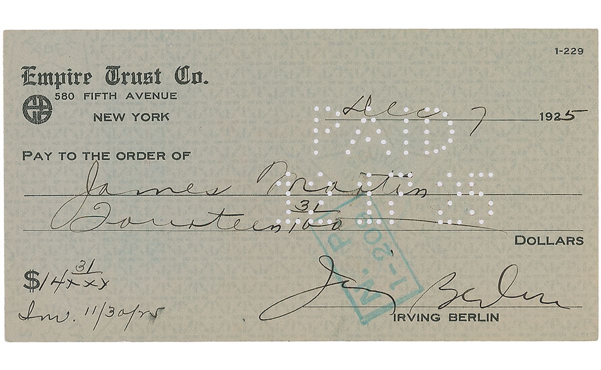 Uncommon bank check, 6 x 3, filled out and signed by Berlin, payable to James Martin for $14.31, December 7, 1925. In fine condition, with expected holes and a bank stamp over portion of first name of signature.