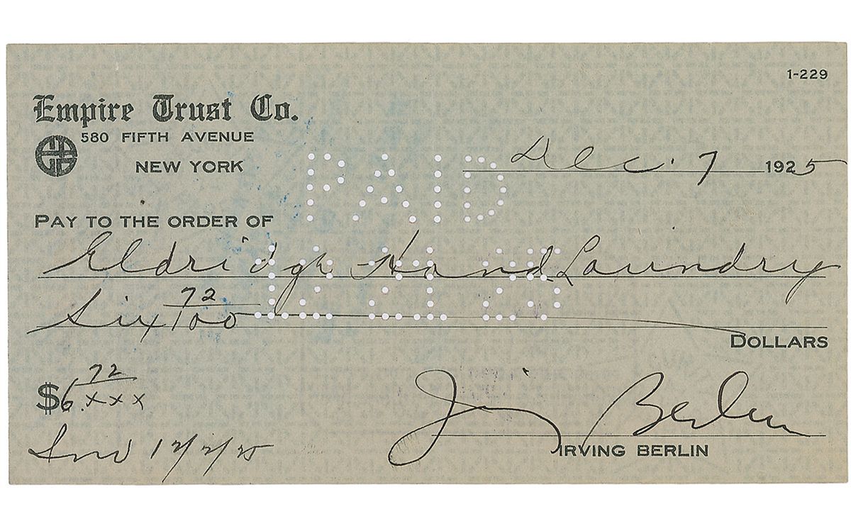 Uncommon bank check, 6 x 3, filled out and signed by Berlin, payable to Eldridge Hand Laundry for $6.72, December 7, 1925. In fine condition, with cancellation holes to upper portion and a few light creases.