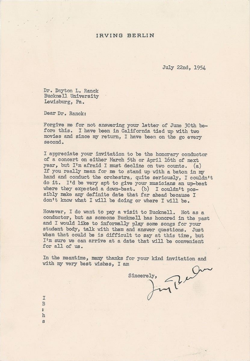 TLS, one page, 7.25 x 10.5, personal letterhead, July 22, 1954. Letter to Dayton L. Ranck, in part: “I appreciate your invitation to be the honorary conductor on either March 5th or April 16th of next year, but I’m afraid I must decline on two counts. (a) If you really mean for me to stand up with a baton in my hand and conduct the orchestra, quite seriously, I couldn’t do it. I’d be very apt to give your musicians an up-beat where they expected a down-beat. (b) I couldn’t possibly make any definite date that far ahead because I don’t know what I will be doing or where I will be. However, I do want to pay a visit to Bucknell. Not as a conductor, but as someone Bucknell has honored in the past and I would like to informally play some songs for your student body, talk with them and answer questions. Just when that could be is difficult to say at this time, but I’m sure we can arrive at a date that will be convenient for all of us.” In fine condition, with several tack holes to upper left corner. Accompanied by an unsigned postcard photo of Berlin.