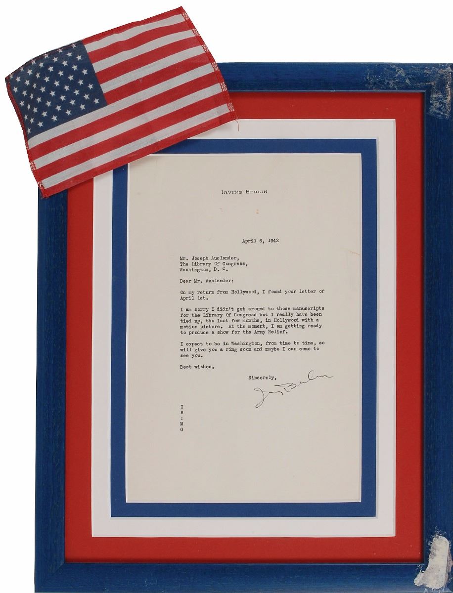 TLS, one page, 7.25 x 11, personal letterhead, April 6, 1942. Letter to poet Joseph Auslander at the Library of Congress, in part: “I am sorry I didn’t get around to those manuscripts for the Library of Congress but I really have been tied up, the last few months, in Hollywood with a motion picture [Holiday Inn, which introduced his famous song ‘White Christmas’]. At the moment, I am getting ready to produce a show for the Army Relief.” Patriotically triple-matted and framed. Light scattered stains and creases, otherwise fine condition.