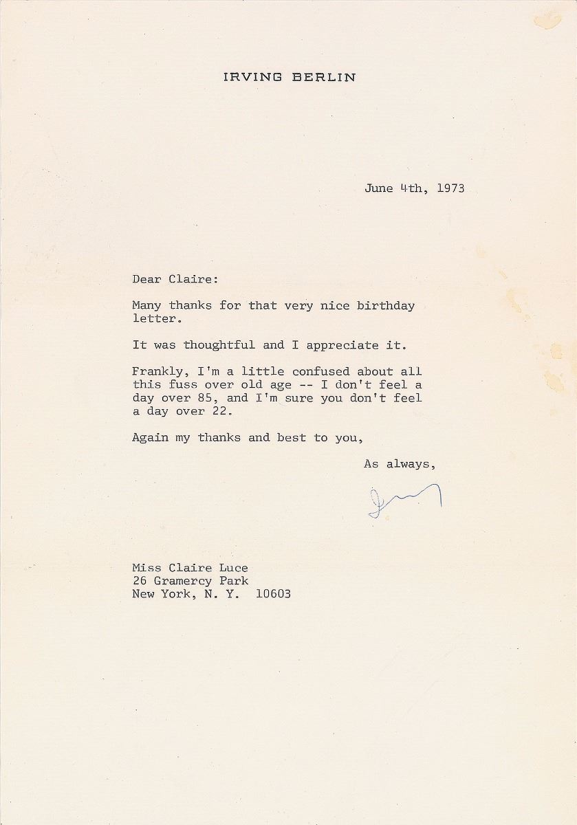 Three TLSs signed “Irving,” each one page, 7.25 x 10.5, personal letterhead, dated between 1953 and 1973. All three are appreciation letters in which Berlin thanks the recipient for their birthday wishes. In overall fine condition. Accompanied by one original mailing envelope.
