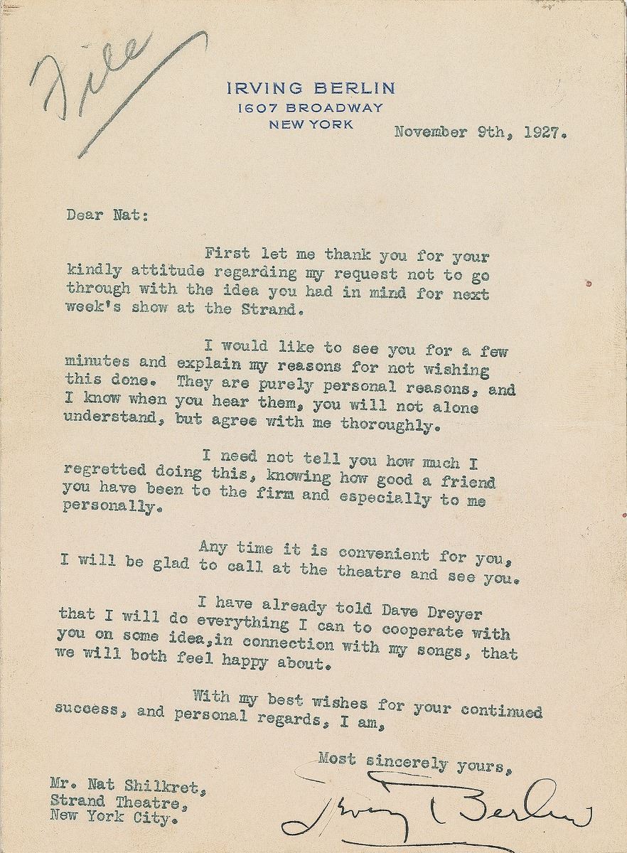 TLS, one page, 5.75 x 7.75, personal letterhead, November 9, 1927. Letter to Nat Shilkret, in part: “First let me thank you for your kindly attitude regarding my request not to go through with the idea you had in mind for next week’s show at the Strand…I need not tell you how much I regretted doing this knowing how good a friend you have been to the firm and especially to me…I have already told Dave Dreyer that I will do everything I can to cooperate with you on some idea, in connection with my songs, that we will both feel happy about.” In fine condition.