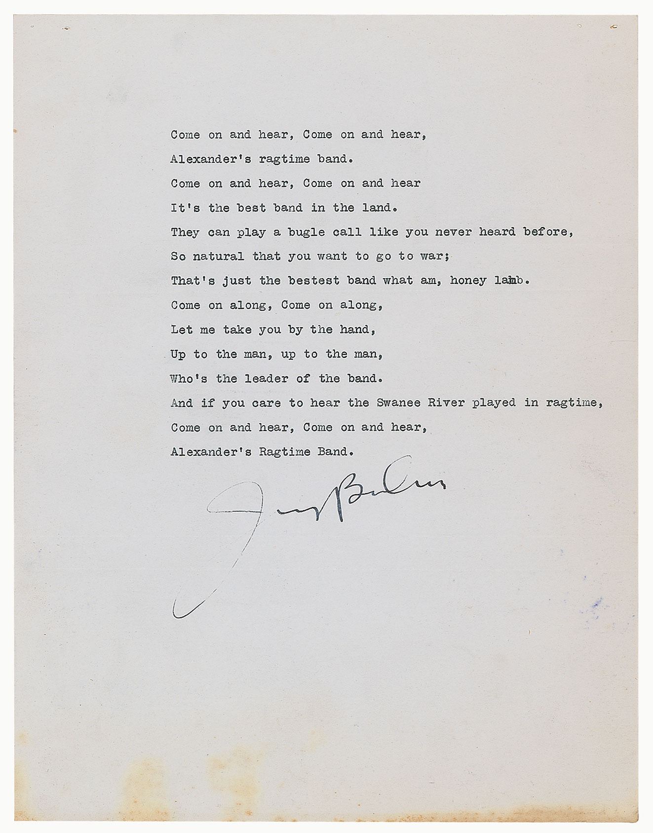 Souvenir typescript containing the lyrics to the song 'Alexander's Ragtime Band,' one page, 8.5 x 11, signed at the conclusion in fountain pen by Irving Berlin. The lyrics, in part: "Come on and hear, come on and hear / Alexander's Ragtime Band. / Come on and hear, come on and hear / It's the best band in the land. / They can play a bugle call like you never heard before, / So natural that you want to go to war; / That's just the bestest band what am, honey lamb." In very good to fine condition, with four horizontal folds, staining to the bottom, and staple holes to the top edge. Accompanied by a transmittal letter from Berlin's secretary, dated April 10, 1941.