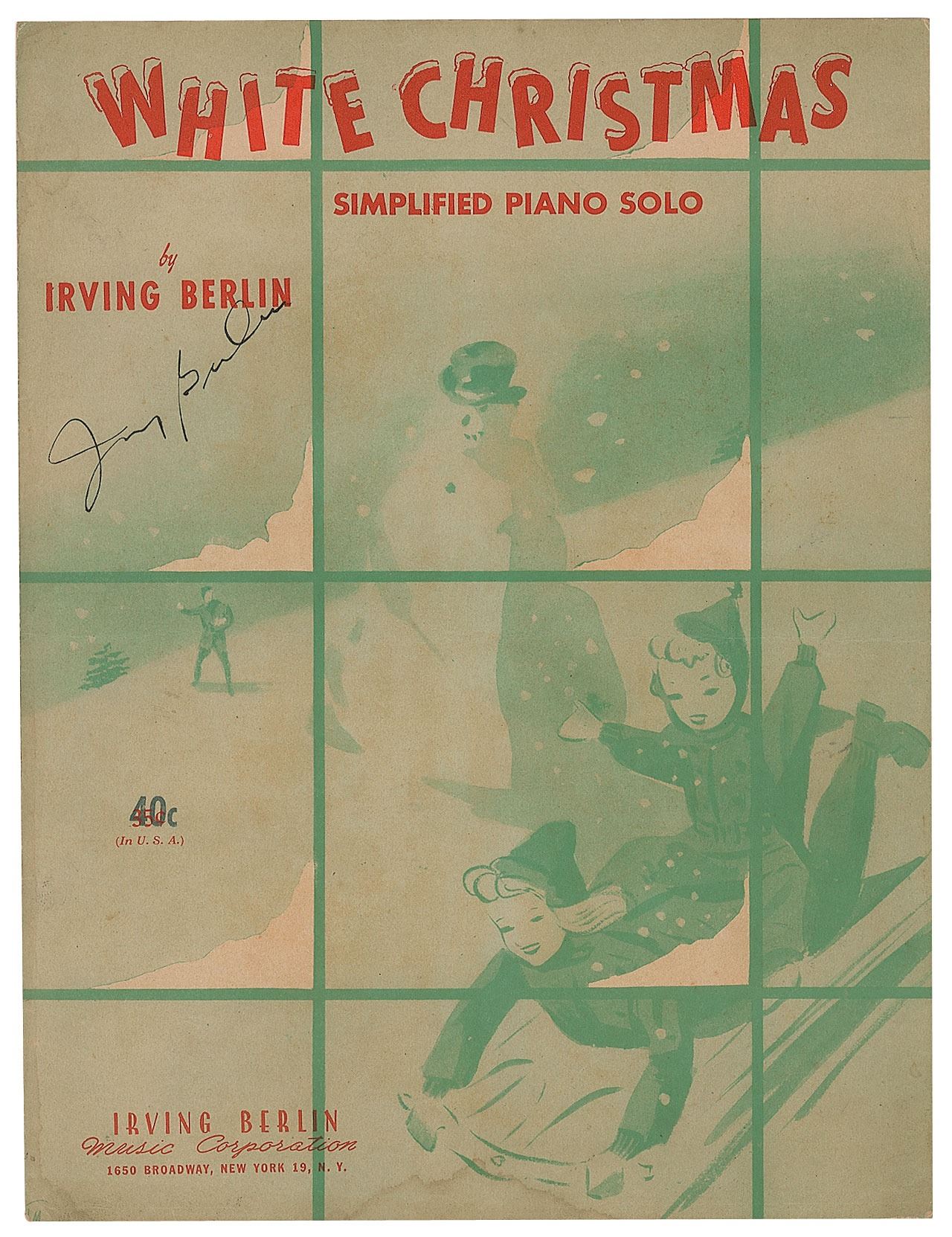 Sheet music for Irving Berlin's popular carol "White Christmas," two pages, 9 x 2, boldly signed on the front cover in fountain pen. In very good to fine condition, with faint overall staining. A hugely desirable and scarce signed score for Berlin's most famous and popular tune.