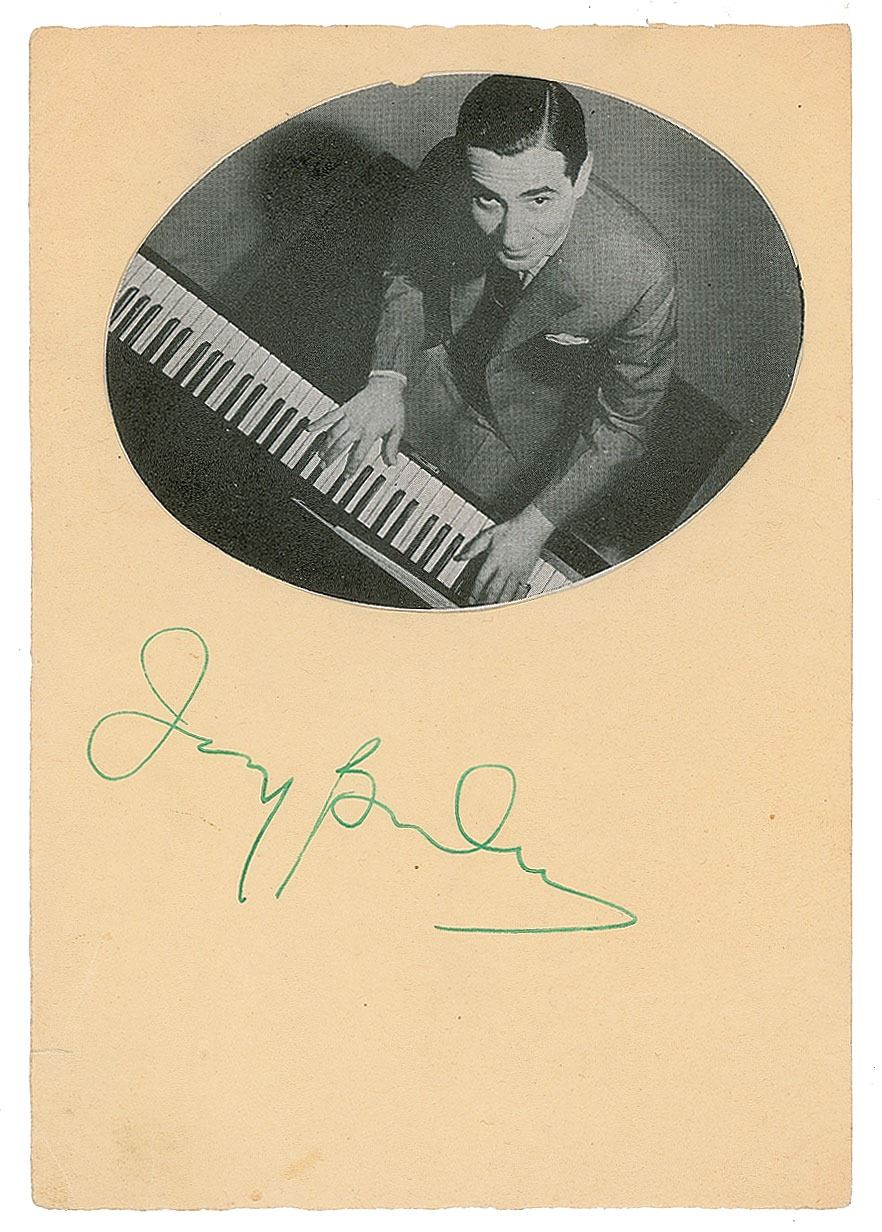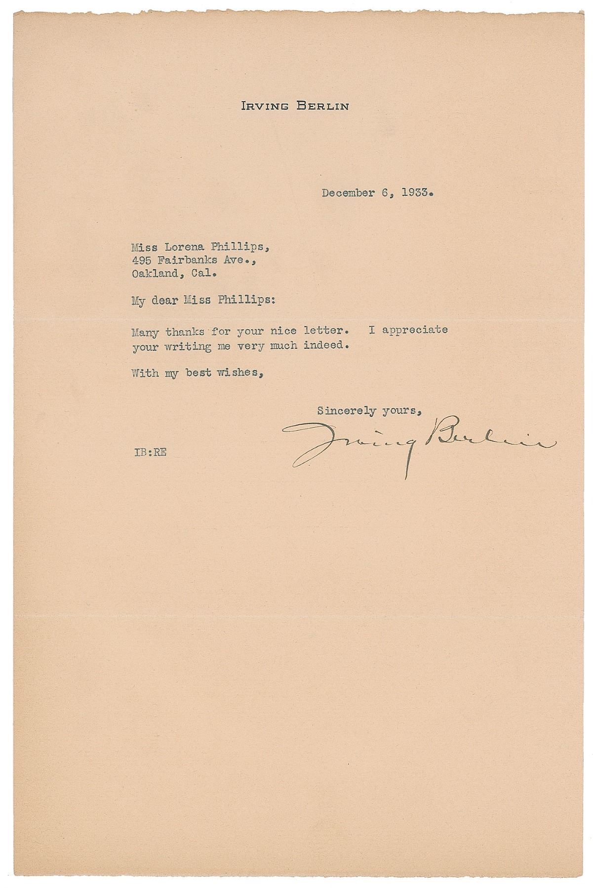Two items: a green fountain pen signature, "Irving Berlin," on an off-white 4.25 x 6.25 album page with an affixed image; and a TLS, one page, 7.25 x 11, personal letterhead, December 6, 1933, addressed to Lorena Phillips, in full: "Many thanks for your nice letter. I appreciate your writing me very much indeed." In overall fine condition.