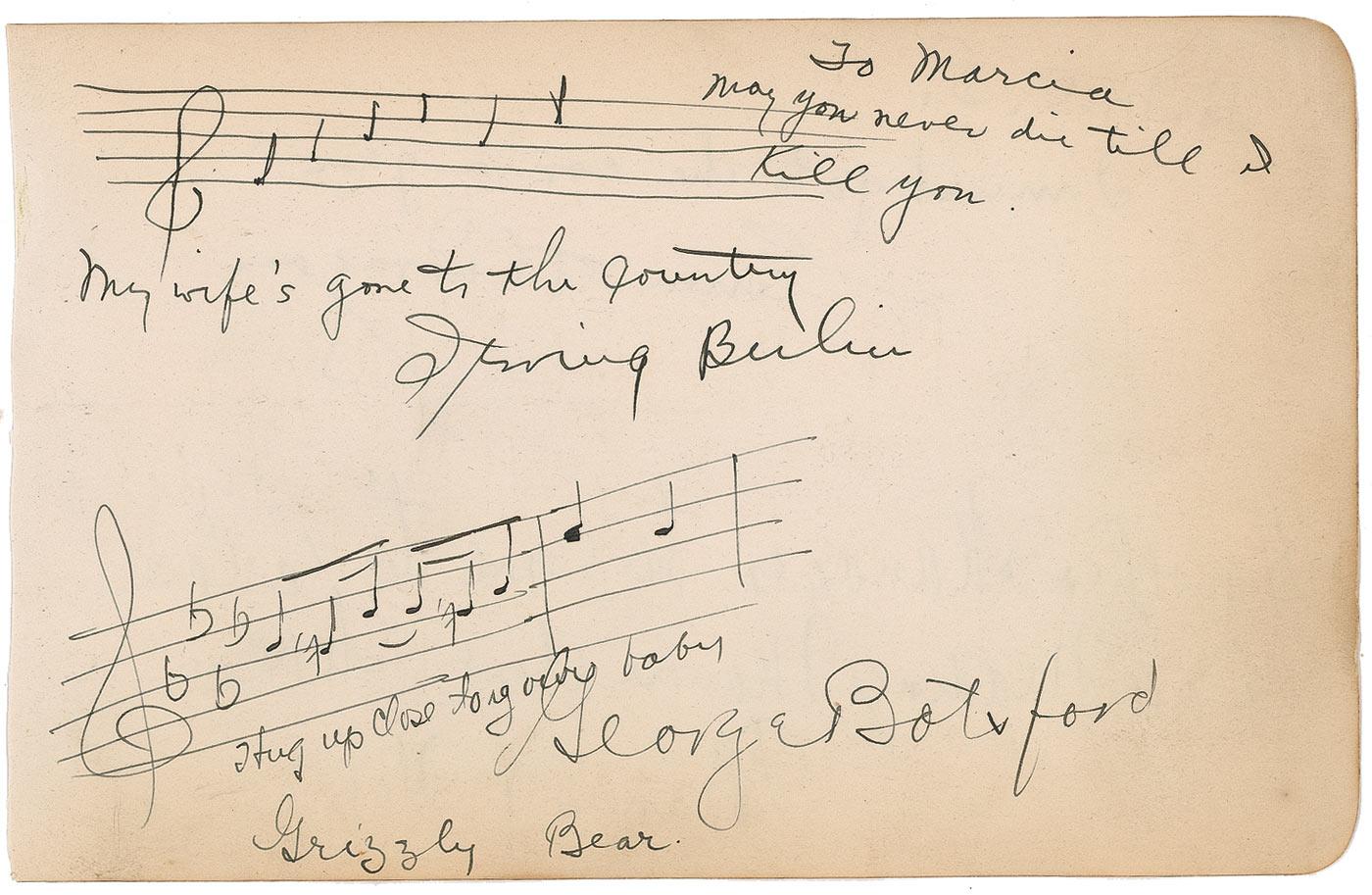 Dark and brooding AMQS on an off-white 7.5 x 4.75 album page. Berlin pens a one-bar quote from his early song “My Wife’s Gone to the Country,” signed and inscribed “To Marcia, May you never die till I kill you, Irving Berlin.” Page also bears an AMQS by George Botsford. Mild toning working in from edges, and slight show-through from signatures on reverse, otherwise fine condition.