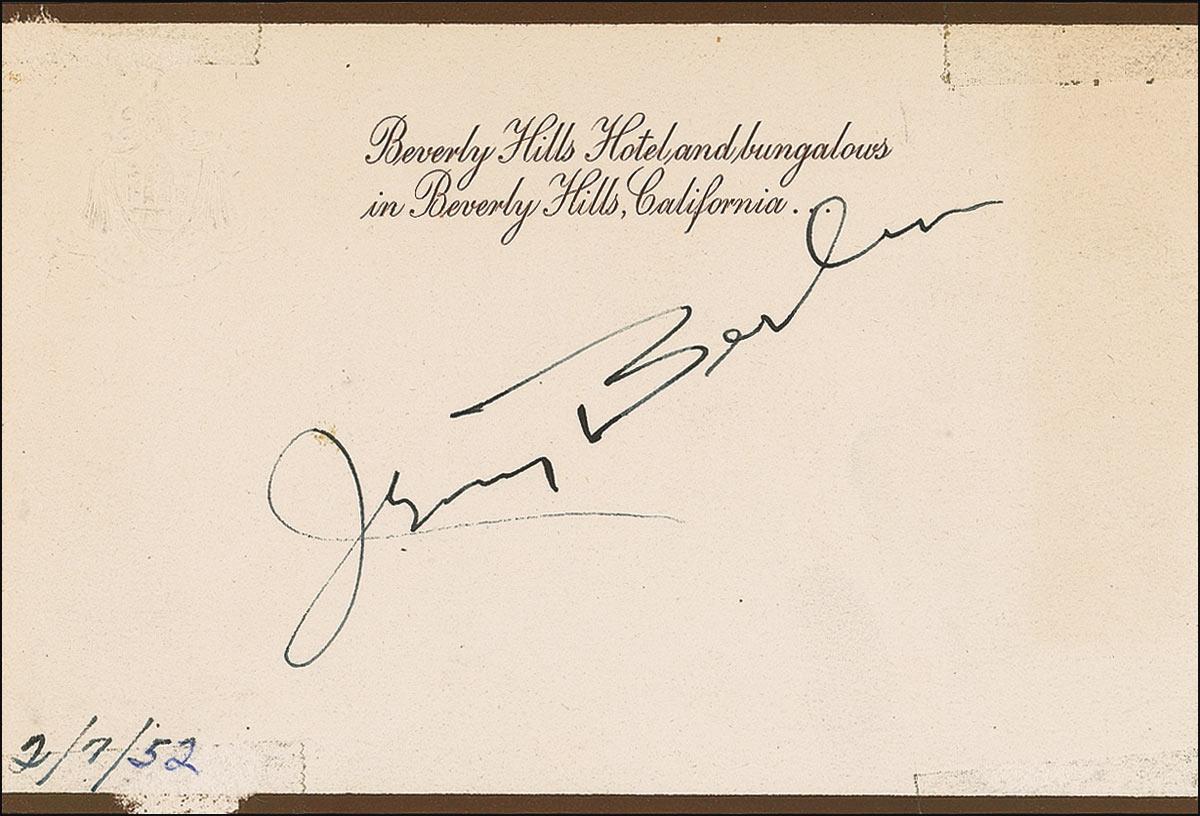 Vintage ink signature, “Irving Berlin,” on an off-white 5 x 3.5 Beverly Hills Hotel and bungalows embossed card, dated at the bottom in another hand February 7, 1952. Scattered toning from mounting remnants on reverse, as well as to both vertical edges, and small adhesive remnants to each corner, otherwise fine condition.