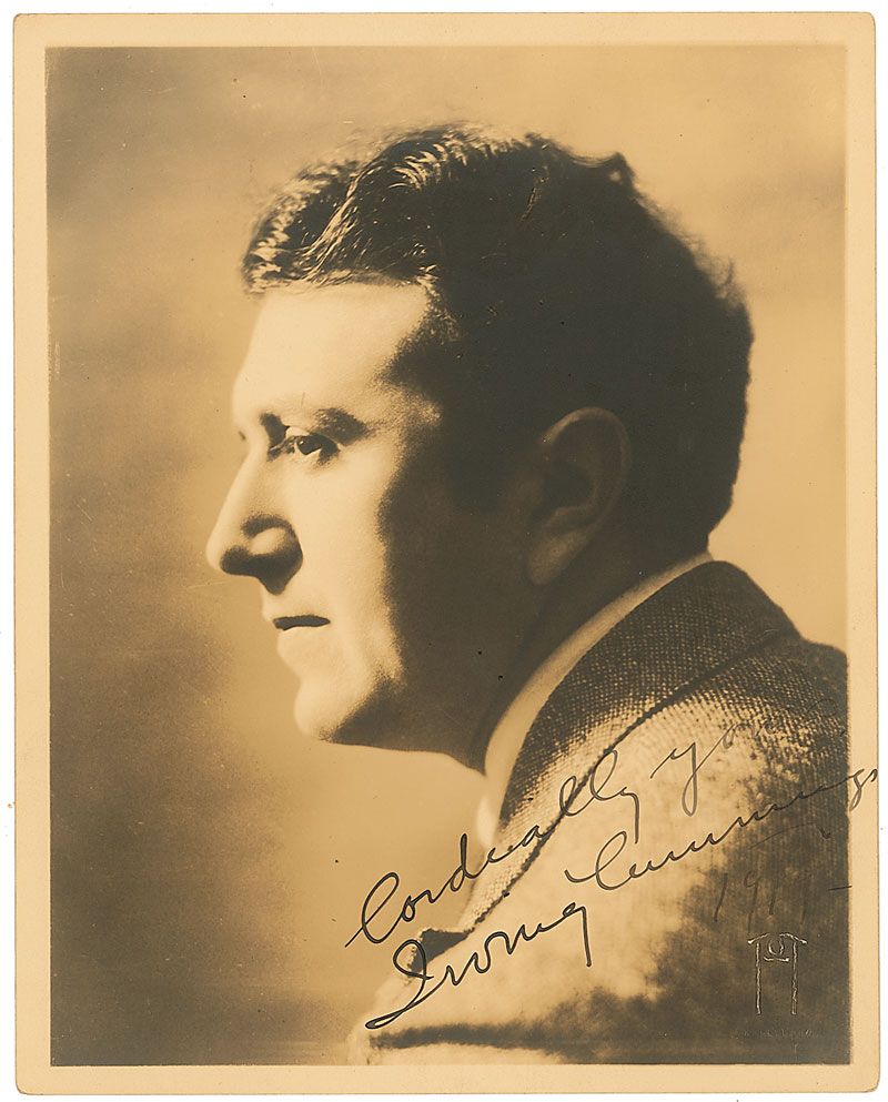 Academy Award–nominated director and actor (1888–1959) known for In Old Arizona, Grand Canary, and Little Miss Broadway. Shadowy vintage sepia matte-finish 8 x 10 portrait of Cummings in profile, boldly signed in fountain pen, “Cordially yours, Irving Cummings, 1919.” Blindstamped by Browers of Hollywood in the lower right. In fine condition.