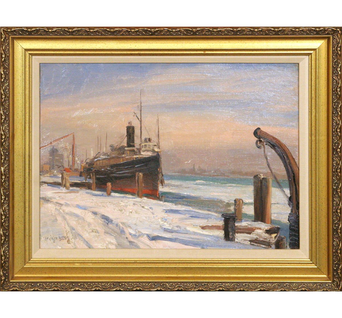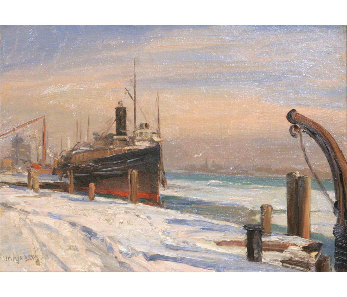 Irving Roscoe Bacon (1875 - 1962). Winter Dock. 13" x 17" oil on canvas. Signed lower left: Irving R. Bacon.