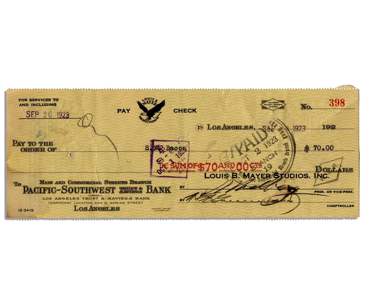 Irving Thalberg check signed during the height of his illustrious career as vice president of Louis B. Mayer Studios. Dated 26 September 1923, check is signed ''Thalberg'' in black ink and made out in type to S.F. Bacon in the amount of $70.00. Measures 8.25'' x 3''. Standard bank cancellations, else near fine.