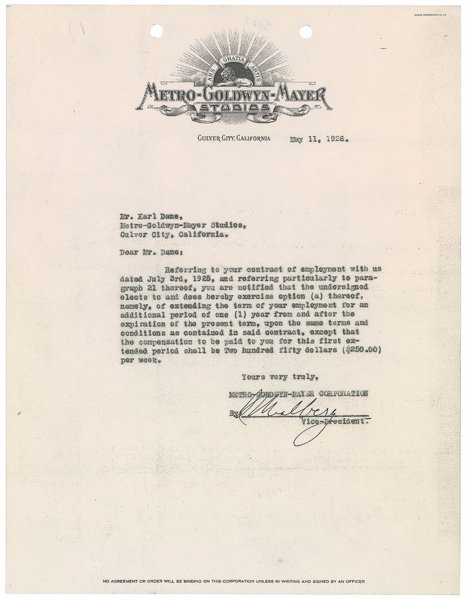 DS, signed “I. Thalberg,” one page, 8.25 x 10.75, May 11, 1926. MGM Studios contract extension issued to actor Karl Dane, stating that “the undersigned elects to and does hereby exercise option (a) thereof, namely, of extending the term of your employment for an additional period of one (1) year.” Signed at the conclusion by Thalberg as vice president of MGM. In fine condition, with several horizontal folds.