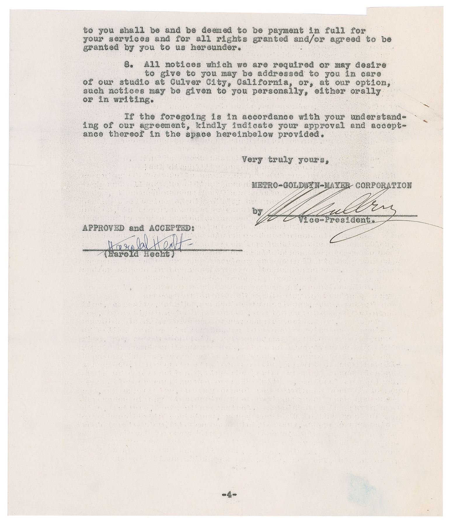DS, four pages, 8.5 x 10, June 16, 1932. Contract between Harold Hecht and Metro-Goldwyn-Mayer, in which the latter employ and engage the services of Hecht "solely and exclusively…in staging and directing dances in connection with our photoplay entitled 'Good Time Girl'" for a period of three weeks and a sum of $1,000. Signed at the conclusion in fountain pen by Irving Thalberg as MGM vice president, and countersigned in black ink by Hecht. In very good to fine condition, with irregularly trimmed top edges, and a paperclip impression to the edge of the signed page. Hecht was a Hollywood film producer, dance director, and talent agent, who early in his career was a contract choreographer at Paramount; in June and July 1932, he was loaned to MGM to serve as a dance director for the Marion Davies film Blondie of the Follies, which was originally entitled Good Time Girl. As a producer, Hecht would win a Best Picture Oscar for the 1955 romantic drama Marty.