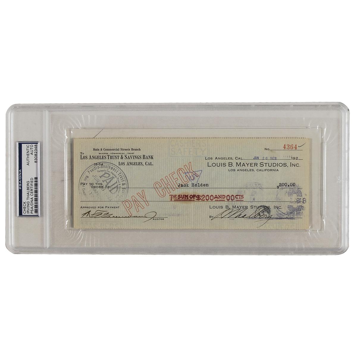 Bank check, 8.25 x 3.25, filled out in type and signed by Thalberg, payable to Jack Holden for $200.00, stamp-dated June 20, 1923. Encapsulated in a plastic PSA/DNA authentication holder. In fine condition, with a vertical fold and expected cancellation stamps on top of his signature.