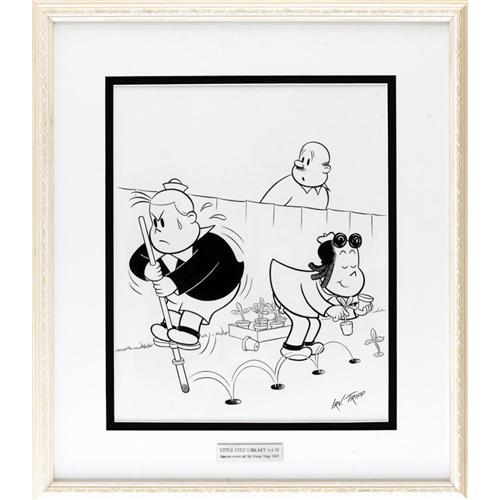 <B>Irving Tripp - Little Lulu Library Set IV Slipcase Cover Illustration Original Art (Another Rainbow, 1987).</B></I> When Little Lulu needs help planting her garden, Tubby hops to it! The image area of this lighthearted Irving Tripp drawing measures approximately 12.5" x 17", and the art is in Excellent condition. <I>From the Estate of Bruce Hamilton.</B></I> <BR><BR><B>Important notice:</B> Heritage usually auctions material at the rate of 200-250 lots per hour. On some occasions eBay Live bid software or the Internet may not be able to keep up with the pace of the auction. We recommend placing a realistic absentee bid now as insurance to avoid disappointment. Occasionally the auctioneer may eliminate or reject an eBay Live bid, and the auctioneer may also reopen a lot after the close of the eBay live bidding (usually because we missed an audience bid), and may reject your bid even if it shows you as the winning bidder. By bidding via eBay Live, you agree that Heritage may award the lot to another bidder at its sole discretion under the circumstances described above or any other reasonable circumstances. Since eBay bids are not shown to us until we open the lot on the floor, we treat those bids just like floor bids. In most cases the floor responds before the eBay bid is presented to us, due to Internet lag time, so for consistency we have made it a policy that floor bids are always considered first over tie eBay live bids. Also please note that all Heritage lots purchased through eBay Live carry a 22.5% Buyer's Premium. Please make sure you read the Terms and Conditions before you bid. This lot is being auctioned in conjunction with a live floor auction by Heritage Auction Galleries. All final auction and invoice information will be supplied by Heritage Auction Galleries, and all other information should be considered preliminary. Lot:41001 <BR><BR><B>Winning Notification and Billing:</B> After the FINAL session in this auction is complete, Heritage will send e-mail and snail mail invoices. This process normally takes several days. All final auction and invoice information will be supplied by Heritage Auction Galleries, and all other information should be considered preliminary. <BR><BR>This auction will be conducted on a live auction floor and over the Internet through eBay Live. If you choose to place an absentee bid, please take a moment to <font color='#0000ff'><u><a href='http://pages.ebay.com/liveauctions/help/before/laabsentee.html'>learn how eBay Live absentee bidding works</a></u></font><font color='#000000'>