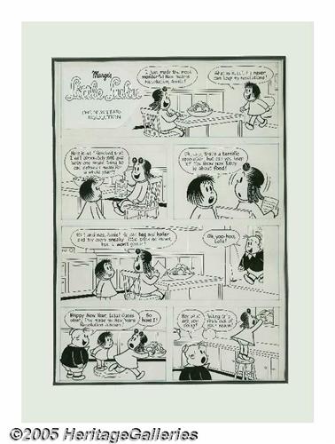 <B>Irving Tripp (attributed) - Little Lulu Title Page Original Art (Gold Key, undated).</B></I> Little Lulu, Tubby, and Annie star in this page featuring Lulu's remarkable "New Year's Resolution" -- one which is sure to be impossible to keep! Writer John Stanley and artist Irving Tripp teamed to create one of the most beloved series of side-splitting stories ever done in <B>Marge's Little Lulu</B></I>. Their work together ran from approximately 1948-1961. Originally John Stanley created both the story and the art, but as the comic became more successful and Dell increased its publishing schedule, the finished art chores were turned over to Irving Tripp, with John Stanley writing and laying out the stories. The image area of this page is 12" x 18", and the art is in Excellent condition. Add a few chuckles to your art collection with this this charming <B>Little Lulu</B></I> page!