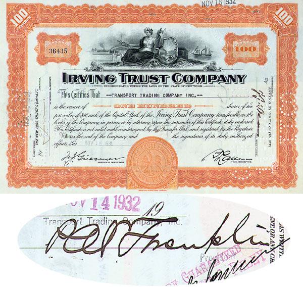 1931, New York. Stock certificate for 100 shares of the Irving Trust Company. Issued to the Transport Trading Company Inc. Signed on verso by P. A. S. FRANKLIN (1871 - 1939). Shipping executive, acknowledged as the "Dean of the shipping industry." When J. P. Morgan interests completed the formation of the International Mercantile Marine in 1903, Franklin served as a vice president and director and in 1915, he was appointed receiver to the insolvent company. During the first World War Franklin served as the chairman of the Shipping Control Committee and, as such, was the supreme director of movements of all military cargoes during the crucial years of the conflict.
