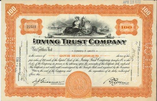 1929, New York. A stock certificate for 100 shares. Orange and black with a vignette of a reclining female allegorical figure at top center flanked by a train and sailing ship. Issued to and signed on verso by Edward F. Swift. Machine punch cancelled.