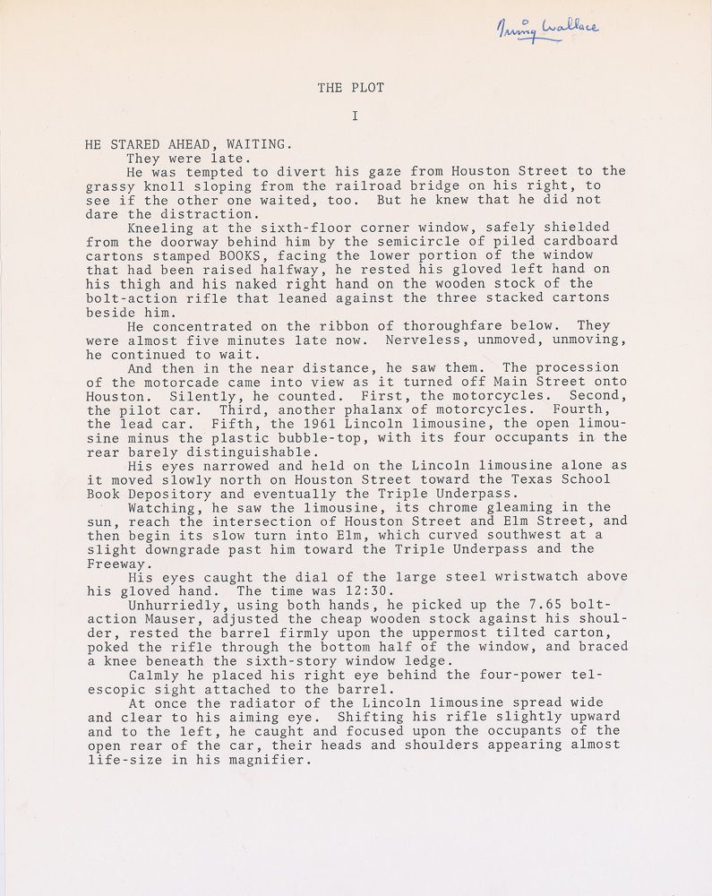 Souvenir typescript, one page, 8.5 x 10.75, an excerpt from The Plot, signed at the top in blue ballpoint. In fine condition, with mild toning to the top.