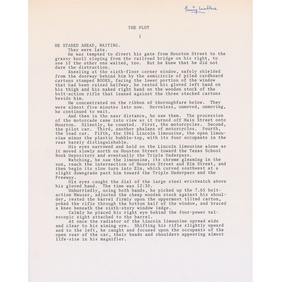 Souvenir typescript, one page, 8.5 x 10.75, an excerpt from The Plot, signed at the top in blue ballpoint. In fine condition, with mild toning to the top.